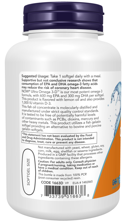 NOW® Ultra Omega 3-D™ is our most potent omega-3 formula, with 600 mg EPA and 300 mg DHA per softgel. This product is flavored with lemon oil and also provides 1,000 IU vitamin D-3.